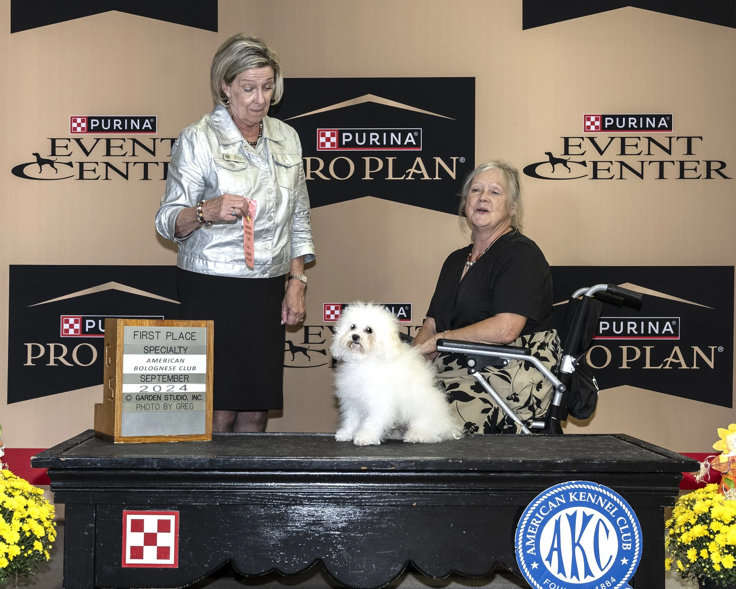 The reserve list is full, but we are taking names for the back up list. The back up list is for if Miss Vera has more than 4 Puppies!! Vera had 7 puppies in her last litter. Well, we have the x-ray results and she has five puppies! They’re currently all spoken for. Photo Below is Vera at the Bolognese Speciality.